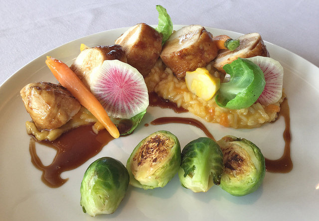 Maple and Truffle Glazed Free Ranged Chicken Breast with butternut squash, parmesan cheese, risotto butter, carrots and, brussels sprouts