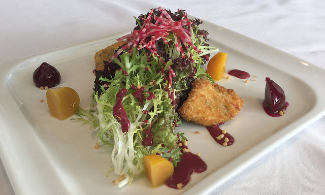 Farmers Market Lollo Rosso Salad with goat cheese fritters, baby farmed beets, pecan and honey huckleberry dressing