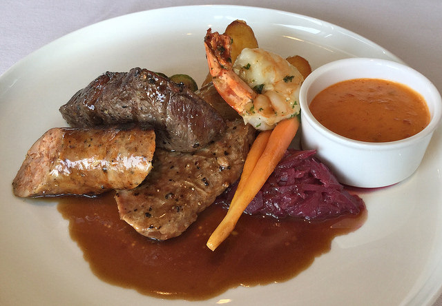 Traditional Mixed Grill with flat iron steak, garlic tiger prawn, pork tenderloin, chorizo sausage, tomato chutney hollandaise, red cabbage and, brussels sprouts