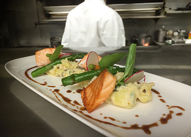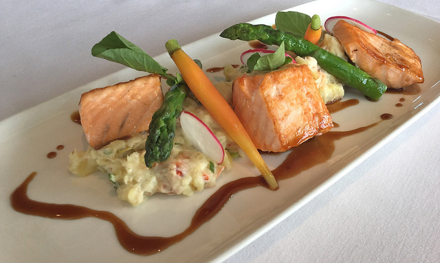 Seared BC Salmon with Pemberton potatoes, lobster hash, truffle infused jus and baby carrots