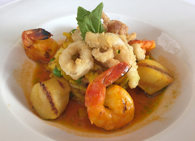 Grilled Scallop and Prawn Paella with saffron risotto, peas, peppers, garlic, white wine, chorizo, Cajun chicken and crispy calamari