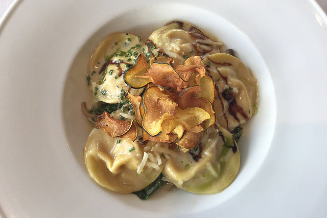 Roasted Pumpkin and Goat Cheese Ravioli with kale, oyster mushroom, garlic, parmesan, ricotta, boursin and, acorn squash chips