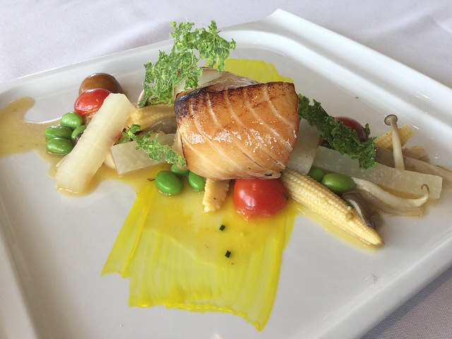Haida Gwaii Sable Fish with maple soy marinade, mushrooms, baby corn, cherry tomato, daikon, edamame cracker and yuzu gel