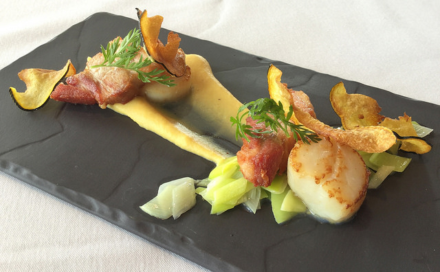 Caramalized Scallop and Pork Belly with butternut squash puree, baby leeks and squash chips