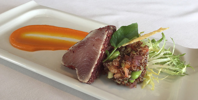 Pink Peppercorn Albacore Tuna with quinoa, edamame beans, pickled onions, yuzu dressing, and jalapeno and carrot puree
