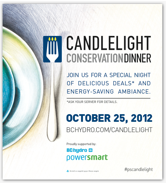 On Thursday, October 25, 2012, join 100+ restaurants across BC by turning down the lights and dialling up the ambiance to raise awareness about energy conservation for the 4th annual Candlelight Conservation Dinner. By dimming the lights by candlelight on October 25 you’ll help raise awareness about the simple actions that save energy.
