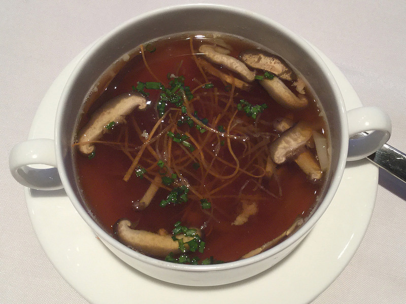 BBQ Duck Consomme with shredded duck, Shiitake mushroom, water chestnut, chives
