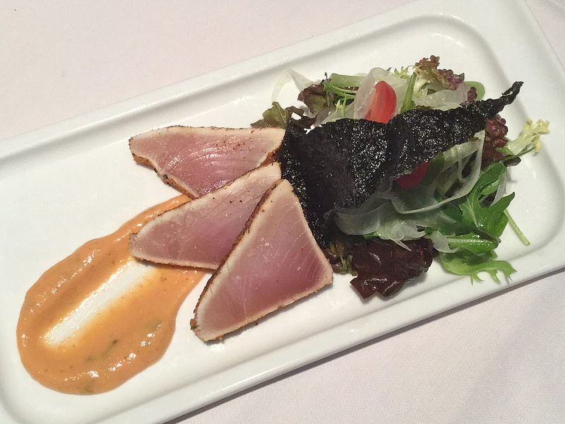 Togorashi Albacore Tuna Tataki with Thai curry yoghurt, fennel salad, lemon oil and cherry tomatoes