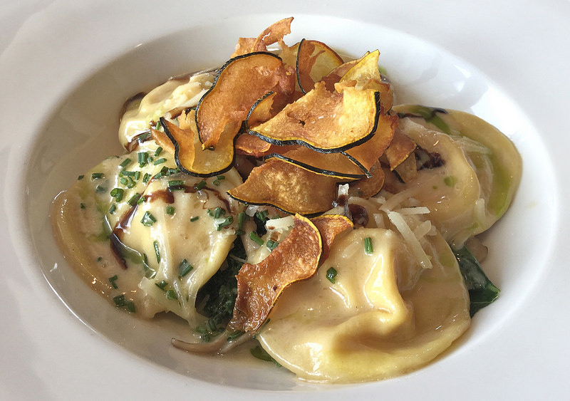 Roasted Pumpkin & Salt Spring Island Goat Cheese Ravioli with sauteed kale and oyster mushroom acorn squash chips, lemon butter sauce and balsamic glaze