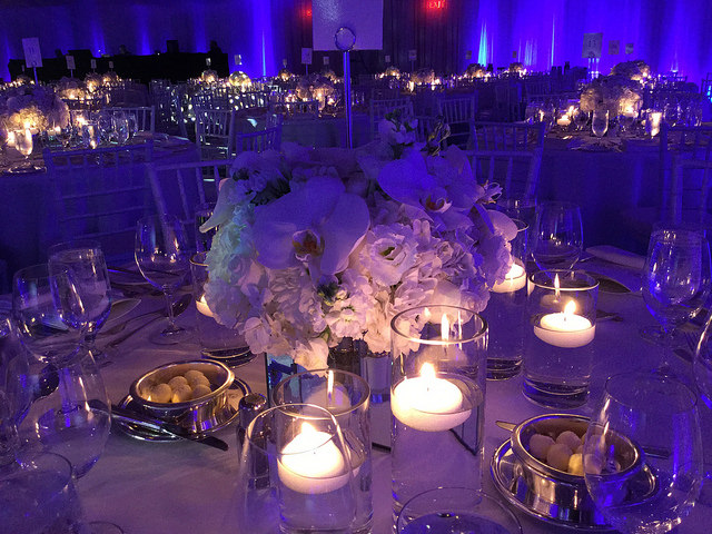 The sold out gala took place in the Crystal Pavilion Ballroom, which was decorated with white sheer wall coverings, white linens and chiavari chairs, hurricane candleholders and a beautiful floral centrepiece on each table.